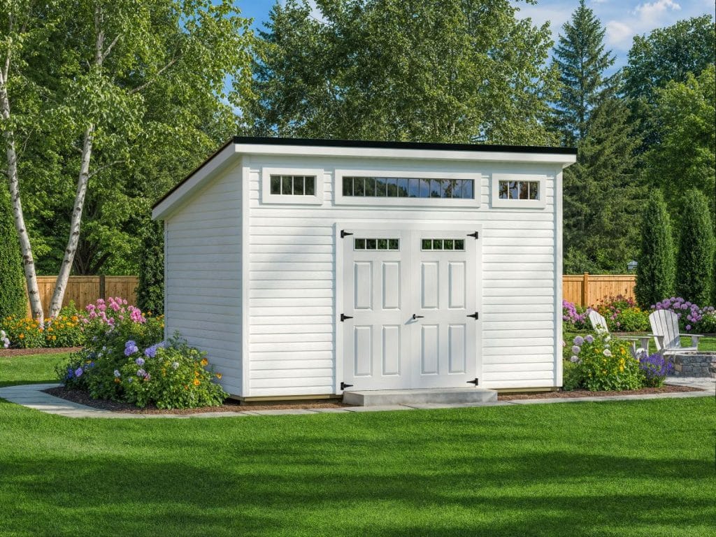Modern single slant roof with 7′ back wall for a classy look. Perfect for an office or backyard retreat.